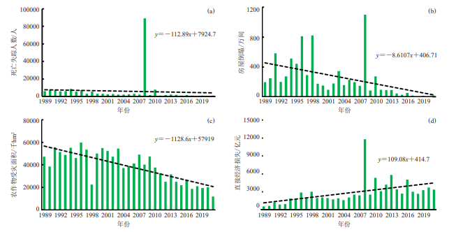 利用1989—2021年中国减灾网、国家统计局发布的数据,以及《西北太平洋热带气旋年鉴》《中国气候公报》《中国民政统计年鉴》等资料,对中国自然灾害、气象灾害、台风灾害进行统计分析,发现中国自然灾害中对人员、经济、农作物危害最大的即为气象灾害,而台风灾害在气象灾害中占比居高位。这33年间,尽管登陆中国的热带气旋个数并未呈现显著升降趋势,但致灾的热带气旋个数略有增加趋势;因台风灾害造成的死亡失踪人数、房屋倒塌数、农作物受灾面积和直接经济损失在国内生产总值中的占比均呈下降趋势,这充分表明我国防灾减灾能力有了显著提升。2012—2021年,除农作物受灾面积基本稳定外,其余指标均呈下降趋势,因此加强现代农业气象服务将是未来健全台风灾害防御体系的工作重点。